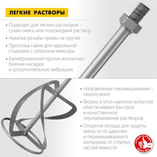 Насадка с лопастями для перемешивания тяжелых растворов (бетон, гипс, стяжка, смола, плиточный клей, известково-глиняный раствор). Используется совместно с ручными миксерами ЗУБР ЗМР-1200Э-1, МР-1050-1, МР-1100, МР-1400-2 и МР-1600-2.