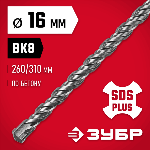 Бур по бетону SDS Plus ЗУБР 29315-310-16, для перфоратора, применяется при сверлении отверстий в бетоне, граните, кирпичной кладке, камне и твердых известняках. Динамичный наконечник бура из твердого сплава ВК8 в форме зубила обеспечивает быстрое вхождение в материал. Спираль 4S с усиленным сердечником обеспечивает оптимальную устойчивость бура к излому.