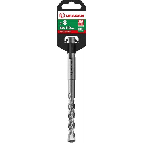 Бур по бетону SDS Plus URAGAN 29311-110-08, для перфоратора, применяется при сверлении отверстий в бетоне, граните, кирпичной кладке, камне и твердых известняках. Динамичный наконечник бура из твердого сплава ВК8 в форме зубила обеспечивает быстрое вхождение в материал. Спираль S4 с усиленным сердечником обеспечивает устойчивость бура к излому.