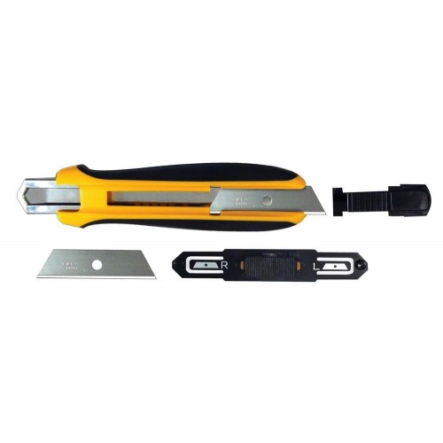 Нож канцелярский OLFA OL-UTC-1, предназначен для резки жестких материалов (для разрезания гипсокартонных плит, обоев, бумаги, кровельных материалов, изделий из резины и кожи и срезания монтажной пены). Рукоятка Comfort Grip с резиновыми вставками и упорами обеспечивает удобство работы инструментом. Усиленная направляющая из нержавеющей стали. Автоматический фиксатор положения лезвия (пять позиций). Нож удобен при работе как правой, так и левой рукой.Габариты и вес в упаковке:
