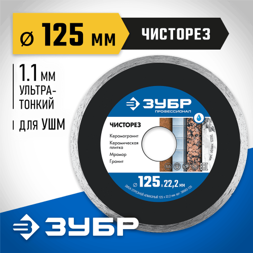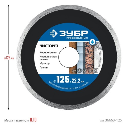 Диск отрезной алмазный сплошной 36663-125 Профессионал, предназначен для резки твердой и мягкой керамической плитки, керамогранита, искусственного и натурального камня, мрамора при обязательном водяном охлаждении. Применяется на УШМ. Супертонкая режущая кромка обеспечивает высокую скорость резки и аккуратный точный распил плитки без трещин и сколов. Оптимально подобранные компоненты металлической связки гарантируют продолжительный рабочий ресурс диска при работе даже с самыми сложными в обработке материалами. Высокая скорость реза и увеличенный рабочий ресурс диска обеспечиваются особой технологией горячего спекания. Высокая концентрация алмазов мелкой фракции обеспечивает идеальную чистоту получаемых кромок.