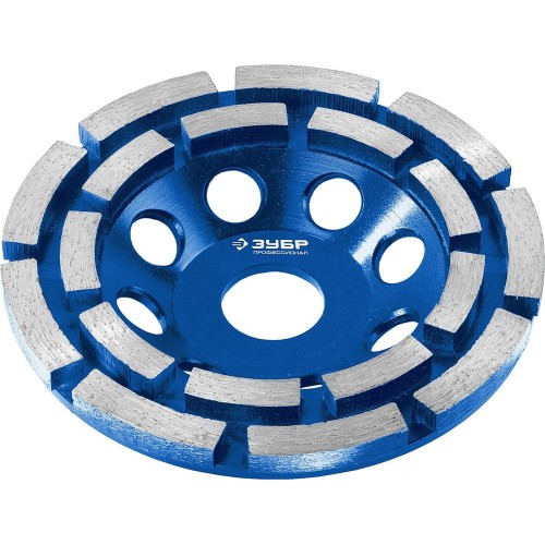 Алмазная чашка ЗУБР 33372-115, используется на УШМ для шлифования бетонных материалов, гранита, природного и искусственного камня. Не требует принудительного водяного охлаждения. Имеет отверстия для естественного охлаждения чашки в процессе шлифования. Корпус алмазной чашки изготовлен из высокопрочной стали. Высота алмазных сегментов 6 мм обеспечивает продолжительный рабочий ресурс шлифовальной чашки (до 600 квадратных метров площади). Два ряда алмазных сегментов для равномерного шлифования и большого объема работ. Фрезерованное основание чашки не допускает биения и дисбаланса в процессе работы. Каждое изделие проходит строгий контроль качества, особое внимание уделяется сбалансированности, т.к. инструмент работает на больших оборотах.