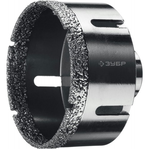 Буровая коронка алмазная ЗУБР 29865-80, применяется для сверления отверстий из керамогранита, камня, керамики, бетона, кирпича, ограниченно листового металла, дерева и комбинаций всех этих материалов. Используется на УШМ. специальная технология вакуумного спекания алмазов позволяет работать без применения водяного охлаждения. Высокий рабочий ресурс.