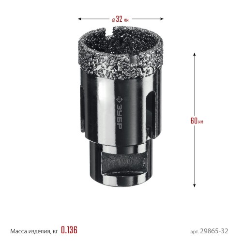 Буровая коронка алмазная ЗУБР 29865-32, применяется для сверления отверстий из керамогранита, камня, керамики, бетона, кирпича, ограниченно листового металла, дерева и комбинаций всех этих материалов. Используется на УШМ. специальная технология вакуумного спекания алмазов позволяет работать без применения водяного охлаждения. Высокий рабочий ресурс.