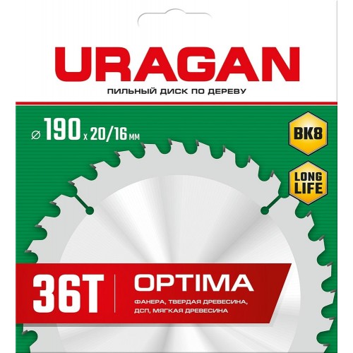 Пильный диск по дереву URAGAN 36801-190-20-36_z01, предназначен для продольных и поперечных пропилов твердой и мягкой древесины, обшивочных необработанных досок, неламинированной ДСП, строительного бруса и строительной древесины с остатками краски. Особая форма твердосплавного зуба с переменным углом наклона верхней плоскости специально разработана для эффективного и производительного пиления различных строительных материалов.