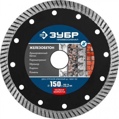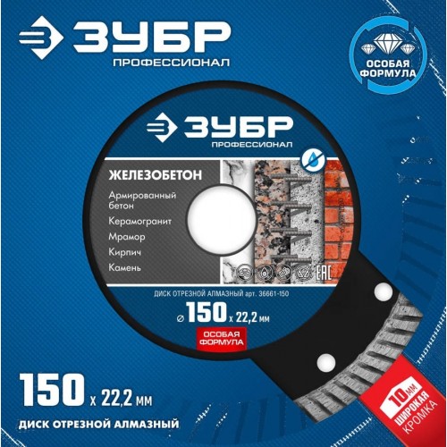 Диск отрезной алмазный 150 х 22.2 мм, ЗУБР 36661-150, предназначен для резки армированного бетона, бордюрного камня, кирпича, тротуарной плитки, керамогранита и других строительных материалов без принудительного охлаждения. Оригинальная сегментированная форма режущей кромки позволяет быстро и эффективно осуществлять необходимые резы в обрабатываемом материале. Оптимально подобранные компоненты металлической связки с высотой сегмента в 10 мм гарантируют продолжительный рабочий ресурс круга при работе даже с самыми сложными в обработке материалами.
