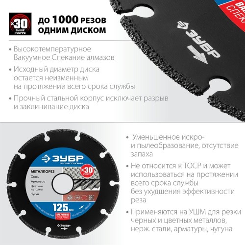 Алмазный диск отрезной ЗУБР 36662-125, предназначен для резки изделий из металла. Технология ВВС (Высокотемпературное Вакуумное Спекание алмазов) позволяет использовать диск для резки всех видов металлов без обязательного водяного охлаждения.