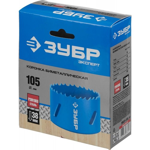 Буровая коронка биметаллическая ЗУБР 29531-105_z01, применяется при сверлении металла, дерева, ДСП, гипсокартона и твёрдых пластмасс. Универсальные биметаллические кольцевые пилы ЗУБР имеют разведённые закалённые зубья повышенной твёрдости с прогрессивным расположением. Благодаря чему гарантируется аккуратное чистовое сверление без трещин и сколов. Компенсационные прорези в корпусе обеспечивают снижение шума при работе, а также предотвращают деформацию пилы вследствие перегрева изделия.