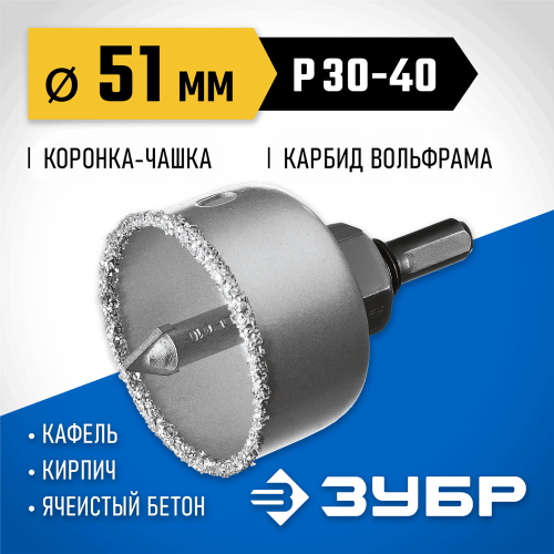 Буровая коронка-чашка с твердосплавным напылением ЗУБР 33360-051_z01, применяется при резке гипсокартона, кафельной и керамической плитки, кирпича, ячеистого бетона. Аккуратное сверление материала без трещин и сколов. Новейшая технология автоматического нанесения и спаивания твердосплавной крошки обеспечивает надежное соединение. Равномерное нанесение твердосплавных режущих элементов обеспечивает аккуратное сверление без трещин и сколов.