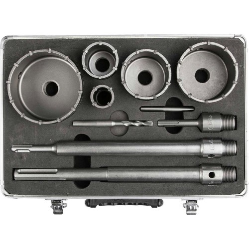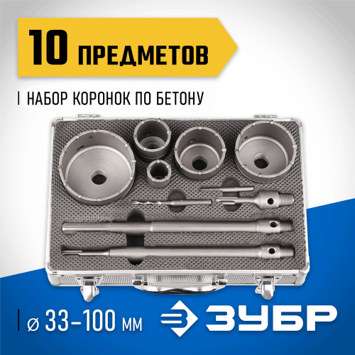 Набор буровых коронок ЗУБР 29185-H10, предназначен для сверления отверстий в бетоне, кирпиче, природном и искусственном камне, а также плотных известняках. Используется с дрелями и перфораторами мощностью не менее 850 Вт в режиме ударного сверления. Коронки позволяют без труда получать отверстия среднего или большого диаметра в самых прочных материалах. Имеют твердосплавные зубья из сплава ВК85, усовершенствованную систему крепления сверла на конус и резьбовое соединение с державкой М22. Твердосплавные зубья из сплава ВК85 позволяют эффективно дробить обрабатываемый материал. Специальная спиралевидная форма корпуса коронки из высокопрочной стали уменьшает трение о стенки отверстия, ускоряет отвод шлама и повышает срок службы инструмента. Конусная посадка обеспечивает возможность быстрой фиксации и замены центрирующего сверла без применения дополнительных крепежных элементов. Резьбовая посадка М22 обеспечивает надежное крепление коронки с державкой. Износостойкое покрытие защищает от коррозии.