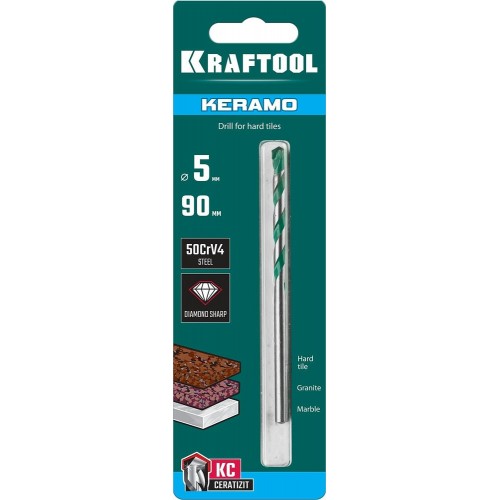 Сверло по керамограниту KRAFTOOL 29175-090-5, применяется для сверления отверстий в стекле, керамической и кафельной плитке, керамограниту, мрамору. Сверхпрочная твердосплавная пластина.Специальная алмазная заточка режущих кромок. Корпус сверла из высоколегированной стали.