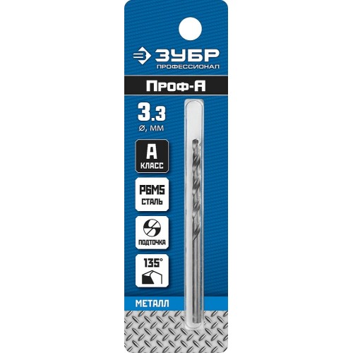 Сверло ЗУБР 29625-3.3, предназначено для обработки легированных и углеродистых сталей с пределом прочности до 900 Н/мм², цветных металлов, серого чугуна и пластмассы. Качественное и точное сверло с большим ресурсом. Сверло изготовлено методом шлифования профиля по ГОСТ 10902-77 и соответствует классу точности сверления "А1". Крестообразная подточка позволяет начать сверлить без предварительного кернения. Угол заточки при вершине равный 135° повышает производительность работ.