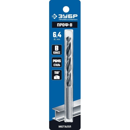 ЗУБР Ø 6.4 x 101 мм, сталь Р6М5, класс В, сверло по металлу 29621-6.4 Профессионал