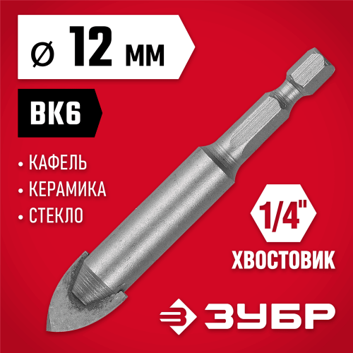 Сверло по кафелю и стеклу 12 мм ЗУБР 29840-12, предназначено для сверления отверстий в стекле, керамической и кафельной плитке. Наконечник сверла из твердого сплава BK6. Специальная заточка режущих кромок улучшает прохождение материала. Шестигранный хвостовик для предотвращения проворачивания в сверлильном патроне. Специальная проточка хвостовика 1/4" для использования быстросъемных адаптеров.