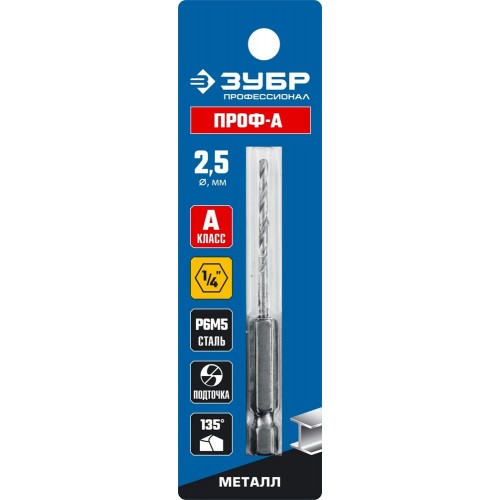 Сверло ЗУБР 29623-2.5, предназначено для обработки легированных и углеродистых сталей с пределом прочности до 900Н/мм², цветных металлов, серого чугуна и пластмассы. Качественное и точное сверло с большим ресурсом. Изготовлено из стали Р6М5 и имеет высокою теплостойкость и продолжительный срок службы. Сверло изготовлено методом шлифования профиля и соответствует классу точности "А1". Шестигранный хвостовик с проточкой исключает возможность проворачивание сверла в патроне и облегчает замену инструмента. Крестообразная подточка позволяет начать сверлить без предварительного кернения. Угол заточки при вершине равный 135° повышает производительность работ.