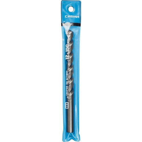 Сверло по бетону СИБИН 29112-150-12, предназначено для работ по бетону, граниту, природному и искусственному камню, кирпичной кладке. Тип спирали: U-образная спираль. Тип хвостовика: цилиндрический.