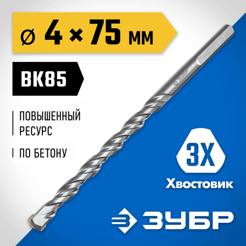 ЗУБР 4 x 75 мм, 3-х гранный хвостовик, сверло по бетону усиленное 2916-075-04_z01 ПРОФЕССИОНАЛ