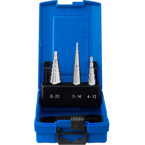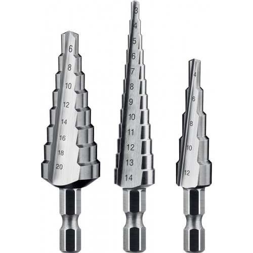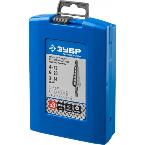Ступенчатое сверло по металлу набор ЗУБР 29670-3-20-H3_z01, предназначено для сверления листового металла толщиной до 4 мм, цветных металлов, пластмасс и других материалов. Сверло изготовлено методом шлифования профиля по ГОСТ 10902-77 и соответствует классу точности сверления "А1". Угол заточки при вершине равный 135°, оснащенный крестообразной подточкой, позволяет сверлить тугоплавкие металлы и сплавы без предварительного кернения.