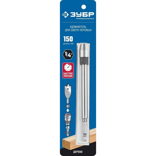 Удлинитель для перовых сверл ЗУБР 29508-150_z01, предназначен для увеличения рабочей длины перового сверла при сверлении отверстий в древесине. Быстросъемный механизм позволяет существенно сократить время смены инструмента. Шестигранный хвостовик с проточкой обеспечивает быструю фиксацию удлинителя в патроне.