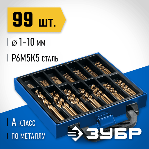 Набор сверл по металлу ЗУБР 29626-H99, предназначен для сверления металлических конструкций и заготовок. Сверло изготовлено методом шлифования профиля по ГОСТ 10902-77 и соответствует классу точности сверления "А1". Крестообразная подточка позволяет начать сверлить без предварительного кернения. Угол заточки при вершине равный 135° повышает производительность работы.