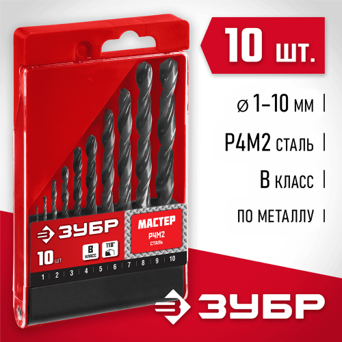 Набор сверел Зубр 29605-H10, предназначен для обработки легированных и углеродистых сталей с пределом прочности до 800Н/мм2, цветных металлов, серого чугуна и пластмассы. Универсальное сверло для большинства задач. Изготовлено методом винтового проката по ГОСТ 10902-77 и соответствует классу точности "В". Угол заточки 118 градусов позволяет обрабатывать легированные и углеродистые стали.