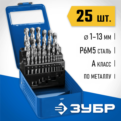 Набор сверл по металлу ЗУБР 29625-H25, предназначен для обработки легированных и углеродистых сталей с пределом прочности до 900Н/мм2, цветных металлов, серого чугуна и пластмассы. Качественное и точное сверло с большим ресурсом. Сверло изготовлено методом шлифования профиля по ГОСТ 10902-77 и соответствует классу точности сверления "А". Крестообразная подточка позволяет начать сверлить без предварительного кернения. Угол заточки при вершине равный 135° повышает производительность работ.