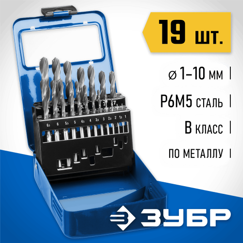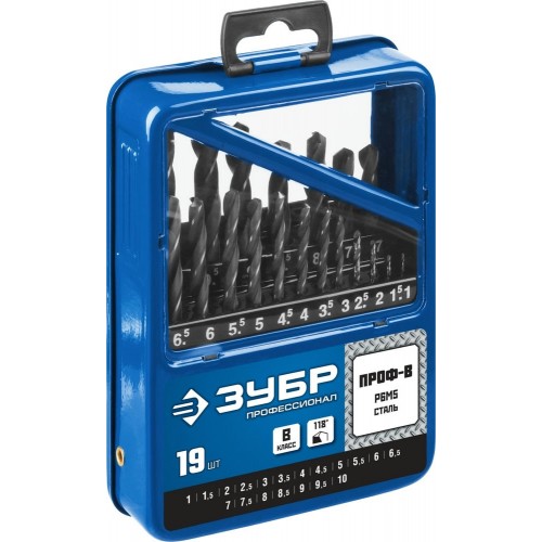 Набор сверел Зубр 29621-H19, предназначен для обработки легированных и углеродистых сталей с пределом прочности до 900Н/мм2, цветных металлов, серого чугуна и пластмассы. Качественное сверло с высоким ресурсом. Изготовлено методом винтового проката по ГОСТ 10902-77 и соответствует классу точности "В". Угол заточки 118 градусов позволяет обрабатывать легированные и углеродистые стали.