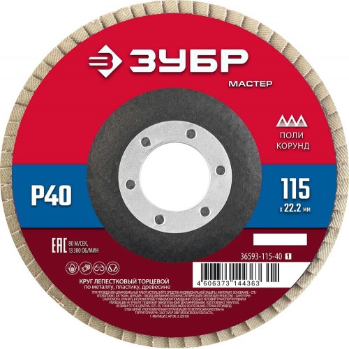 Круг лепестковый торцевой ЗУБР 36593-115-40_z01 предназначен для углошлифовальной машины для шлифования металла, древесины, пластика и других материалов. Электростатический способ нанесения абразивного зерна обеспечивает его равномерное распределение по всей рабочей поверхности лепестка. Усиленная стекловолоконная подложка обладает повышенной прочностью и защищает круг от разрыва и повреждений во время эксплуатации. Повышенная эластичность рабочих лепестков позволяет обрабатывать поверхности со сложным рельефом.