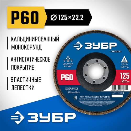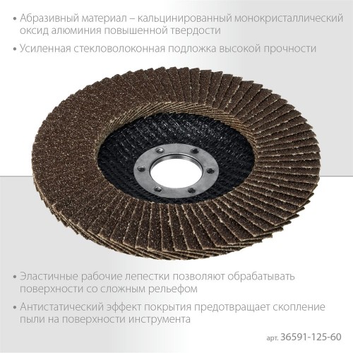 Круг лепестковый торцевой ЗУБР 36591-125-60_z01 применяется на УШМ и предназначен для шлифовальных работ по металлу, древесине и пластику. Абразивный материал – кальцинированный монокристаллический оксид алюминия повышенной твердости. Повышенная эластичность рабочих лепестков позволяет обрабатывать поверхности со сложным рельефом. Усиленная стекловолоконная подложка повышенной прочности. Антистатический эффект покрытия абразивного слоя позволяет предотвратить скопление пыли на поверхности шлифовального инструмента.