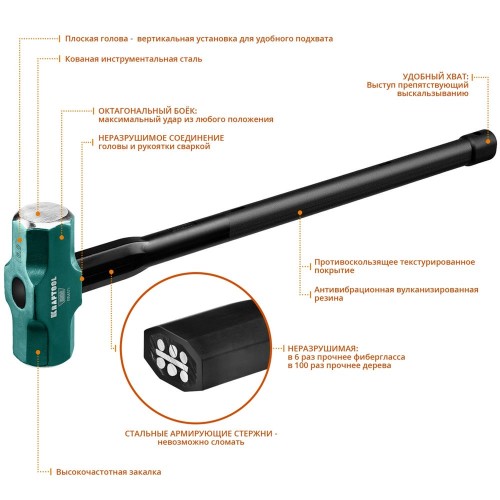 Кувалда KRAFTOOL 2009-6, предназначена для слесарно-монтажных работ. Рукоятка армирована стальными стержнями. Кованая инструментальная сталь. Закалено токами высокой частоты.