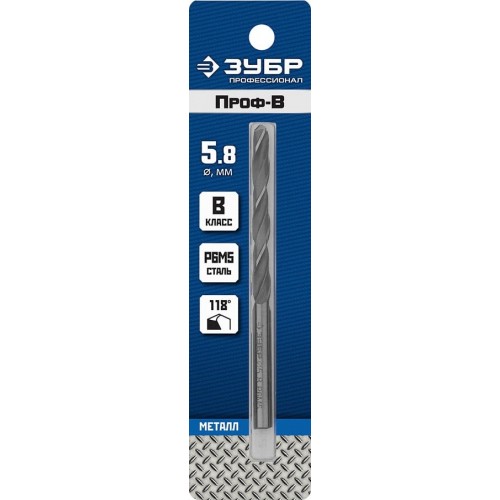 Сверло ЗУБР 29621-5.8, предназначено для обработки легированных и углеродистых сталей с пределом прочности до 900 Н/мм², цветных металлов, серого чугуна и пластмассы. Качественное сверло с высоким ресурсом. Изготовлено методом винтового проката по ГОСТ 10902-77 и соответствует классу точности "В". Угол заточки 118 градусов позволяет обрабатывать легированные и углеродистые стали.