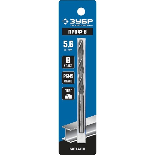 Сверло ЗУБР 29621-5.6, предназначено для обработки легированных и углеродистых сталей с пределом прочности до 900 Н/мм², цветных металлов, серого чугуна и пластмассы. Качественное сверло с высоким ресурсом. Изготовлено методом винтового проката по ГОСТ 10902-77 и соответствует классу точности "В". Угол заточки 118 градусов позволяет обрабатывать легированные и углеродистые стали.