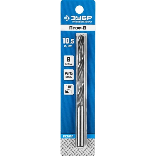 Сверло ЗУБР 29621-10.5, предназначено для обработки легированных и углеродистых сталей с пределом прочности до 900 Н/мм², цветных металлов, серого чугуна и пластмассы. Качественное сверло с высоким ресурсом. Изготовлено методом винтового проката по ГОСТ 10902-77 и соответствует классу точности "В". Угол заточки 118 градусов позволяет обрабатывать легированные и углеродистые стали.