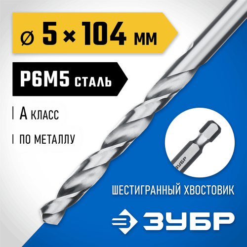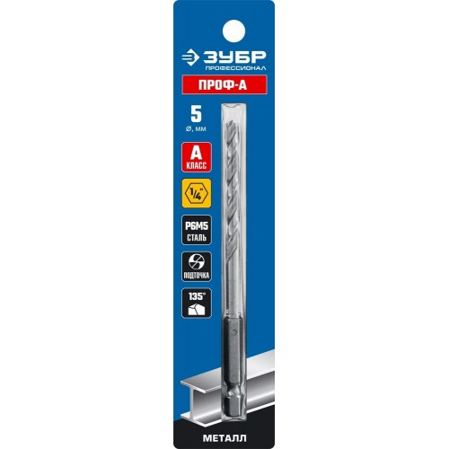 Сверло ЗУБР 29623-5, предназначено для обработки легированных и углеродистых сталей с пределом прочности до 900Н/мм², цветных металлов, серого чугуна и пластмассы. Качественное и точное сверло с большим ресурсом. Изготовлено из стали Р6М5 и имеет высокою теплостойкость и продолжительный срок службы. Сверло изготовлено методом шлифования профиля и соответствует классу точности "А". Шестигранный хвостовик с проточкой исключает возможность проворачивание сверла в патроне и облегчает замену инструмента. Крестообразная подточка позволяет начать сверлить без предварительного кернения. Угол заточки при вершине равный 135° повышает производительность работ.