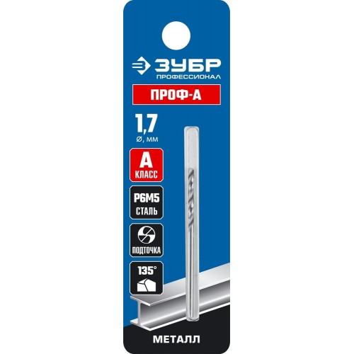 ЗУБР Ø 1.7 x 43 мм, сталь Р6М5, класс А1, сверло по металлу 29625-1.7 Профессионал