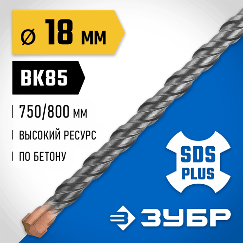 Бур SDS-plus ЗУБР 29314-800-18_z02, предназначен для ударного сверления отверстий в бетоне, граните, кирпичной кладке, камне и твердых известняках. Используются на легких и средних перфораторах с зажимом SDS-plus. Повышенный ресурс благодаря усиленному наконечнику из твердого сплава ВК85. Конструкция головки бура из наконечника с двумя резцами и центрирующим острием для быстрого сверления. Геометрия наконечника в форме зубила для динамичного и агрессивного врезанияв материал. Спираль 4С с усиленным сердечником обеспечивает оптимальное соотношение между устойчивостью к излому бура и быстрым отводом шлама, подавляет вибрацию и способствует лучшей передаче энергии удара непосредственно на твердосплавный резец.