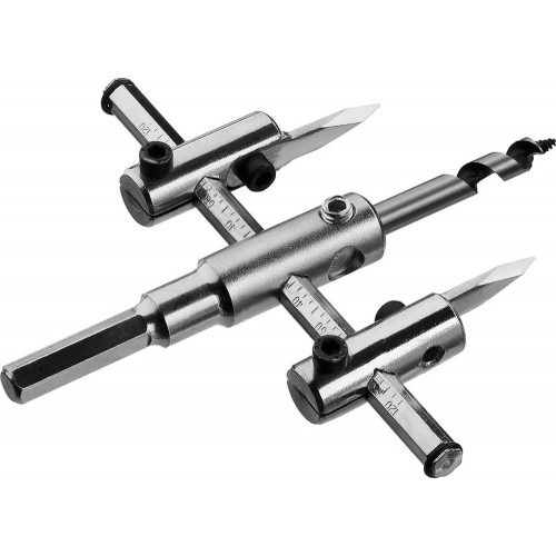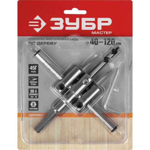 Сверло регулируемое 30-120 мм, ЗУБР 29440-120, применяется в безударном режиме на электрических дрелях и легких перфораторах мощностью не менее 750 Вт для сверления отверстий заданного диаметра в древесине, фанере и ДСП толщиной до 30 мм. Благодаря возможности замены режущих ножей на лезвия из твёрдого сплава представляется возможным обрабатывать такие материалы как гипсокартон, легкие пено- и газобетон, строительный кирпич. Шестигранный хвостовик, предотвращающий проскальзывание в патроне. Наличие размерной линейки на корпусе сверла. Наличие антикоррозионного покрытия.