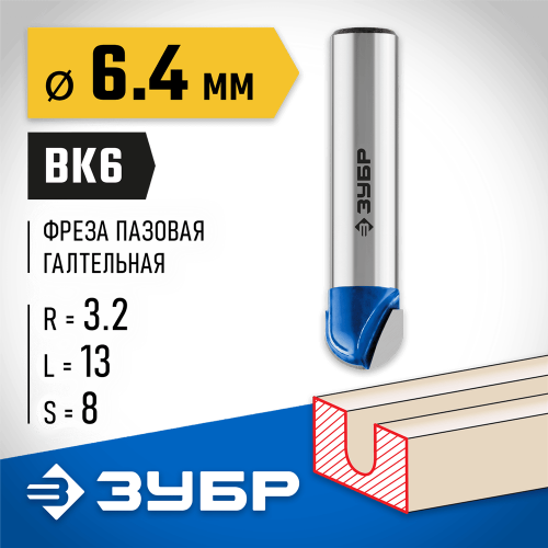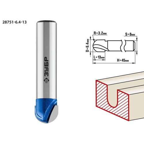 Фреза пазовая галтельная ЗУБР 28751-6.4-13, предназначена для профилирования кромок, изготовления декоративных пазов и рисунков, фрезерования канавок при работе с различными видами древесины. Высококачественный твердый сплав для повышенного ресурса и чистоты обработки. Заточка производится только на самых современных станках с ЧПУ.