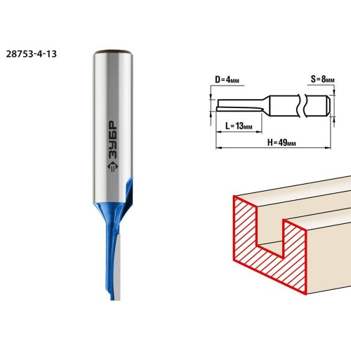 Фреза пазовая прямая ЗУБР 28753-4-13, предназначена для профилирования кромок, изготовления декоративных V-образных пазов и рисунков, фрезерования канавок при работе с различными видами древесины. Высококачественный твердый сплав для повышенного ресурса и чистоты обработки. Заточка производится только на самых современных станках с ЧПУ.