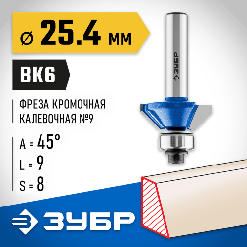 Фреза кромочная калевочная(фасочная) №9 ЗУБР 28711-25.4, предназначена для скругления кромок при обработке столешниц, полок, шкафов и прочих работ с разнообразными видами древесины. Высококачественный твердый сплав для повышенного ресурса и чистоты обработки. Заточка производится только на самых современных станках с ЧПУ. Упорный подшипник позволяет обрабатывать криволинейные кромки без дополнительных приспособлений.