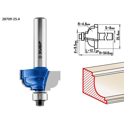 ЗУБР 25.4 x 12.7 мм, радиус 4.8 мм, фреза кромочная калевочная №7 28709-25.4 Профессионал