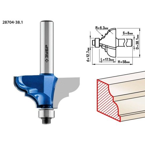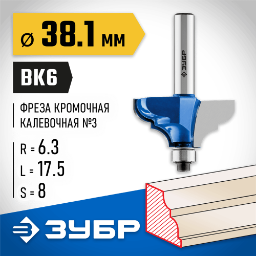 Фреза кромочная калевочная №3 ЗУБР 28704-38.1, предназначена для скругления кромок при обработке столешниц, полок, шкафов и прочих работ с разнообразными видами древесины. Высококачественный твердый сплав для повышенного ресурса и чистоты обработки. Заточка производится только на самых современных станках с ЧПУ. Упорный подшипник позволяет обрабатывать криволинейные кромки без дополнительных приспособлений.