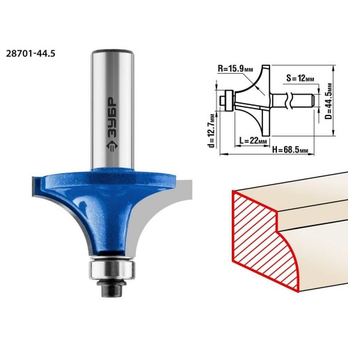 Фреза кромочная калевочная ЗУБР 28701-44.5, предназначена для скругления кромок при обработке столешниц, полок, шкафов и прочих работ с разнообразными видами древесины. Высококачественный твердый сплав для повышенного ресурса и чистоты обработки. Заточка производится только на самых современных станках с ЧПУ. Упорный подшипник позволяет обрабатывать криволинейные кромки без дополнительных приспособлений.