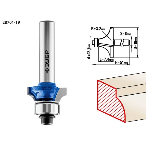 Фреза кромочная калевочная ЗУБР 28701-19, предназначена для скругления кромок при обработке столешниц, полок, шкафов и прочих работ с разнообразными видами древесины. Высококачественный твердый сплав для повышенного ресурса и чистоты обработки. Заточка производится только на самых современных станках с ЧПУ. Упорный подшипник позволяет обрабатывать криволинейные кромки без дополнительных приспособлений.