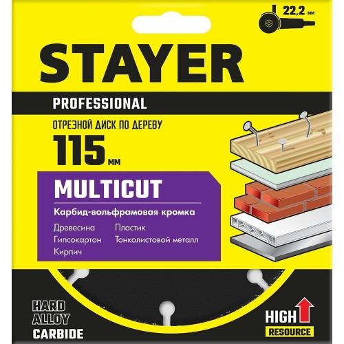Отрезной диск для УШМ STAYER 36860-115, предназначен для грубых, быстрых распилов твердой и мягкой древесины, древесины с гвоздями и остатками цемента, фанеры, пластика, тонколистового и цветного металла, алюминиевого профиля, кирпича, а также гипсокартона.
