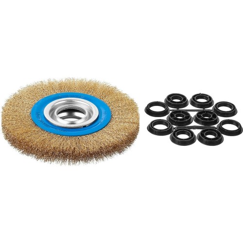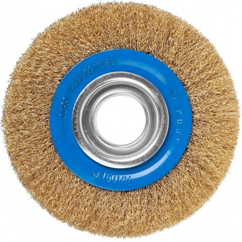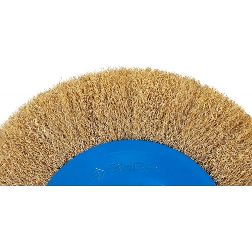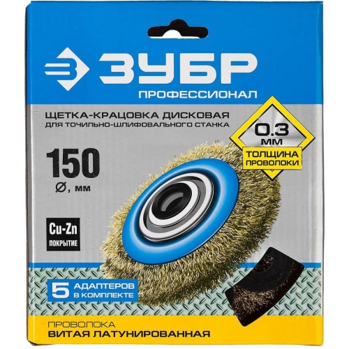 Щетка дисковая для точильно-шлифовального станка 150 мм, ЗУБР 35186-150_z01, для зачистки от лакокрасочных покрытий, ржавчины, окалины и различных загрязнений с поверхностей изделий из стали и цветных металлов. Латунированное покрытие защищает рабочую часть щетки от коррозии. Щадящая обработка поверхности без повреждений благодаря витой проволоке. Зачистная способность рабочих пучков повышена благодаря специальной технологии тримминга.