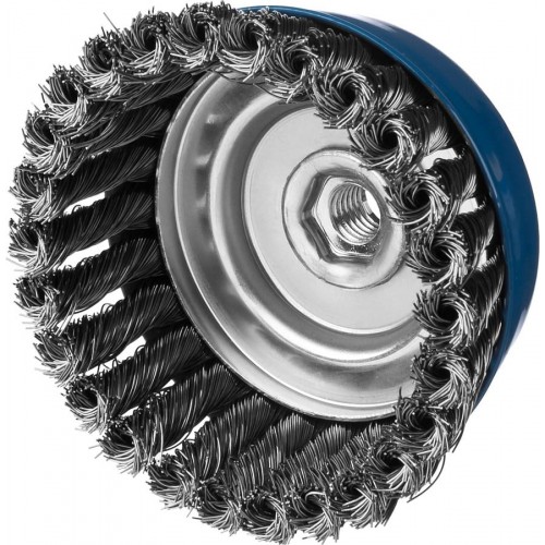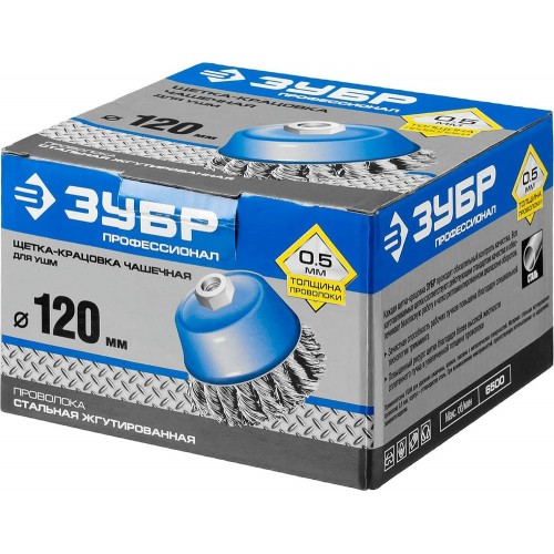 Щетка чашечная для УШМ ЗУБР 35275-120_z02, предназначена для зачистки поверхностей от лакокрасочных покрытий, ржавчины, окалины, различных стойких загрязнений, а также для зачистки сварных швов. Каждая щетка-крацовка ЗУБР проходит обязательный контроль качества. Все изготавливаемые щетки соответствуют действующим стандартам качества и обеспечивают безопасную работу в четко регламентированном диапазоне оборотов. Стальная жгутированная проволока. Повышенный ресурс щетки благодаря еще более высокой жесткости сплетенного пучка и увеличенной толщине проволоки.