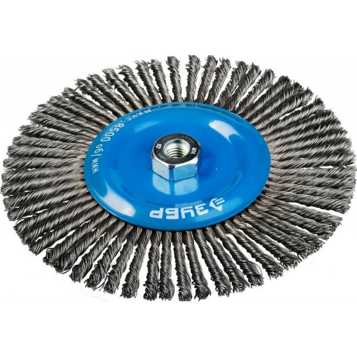 Щетка крацовка дисковая для УШМ ЗУБР 35192-175_z01, предназначена для зачистки поверхностей в труднодоступных местах от лакокрасочных покрытий, ржавчины, окалины, различных загрязнений с применением значительных усилий, а также для зачистки сварных швов. Щетка изготовлена из стальной жгутированной проволоки. Благодаря еще более высокой жесткости сплетенного пучка и увеличенной толщине проволоки щетка обладает повышенным ресурсом.