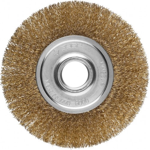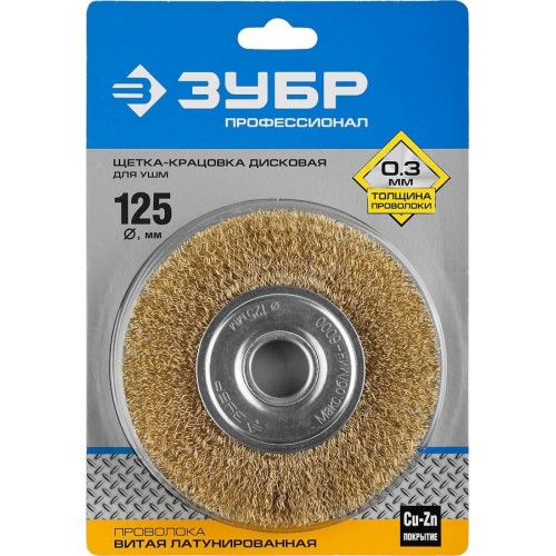 Щетка крацовка дисковая для УШМ ЗУБР 35187-125_z01, предназначена для зачистки поверхностей от лакокрасочных покрытий, ржавчины, окалины и различных загрязнений с поверхностей изделий из стали и цветных металлов. Щетка изготовлена из латунированной витой проволоки. Латунированное покрытие защищает рабочую часть щетки от коррозии. Витая форма проволоки позволяет обрабатывать поверхности без повреждений.