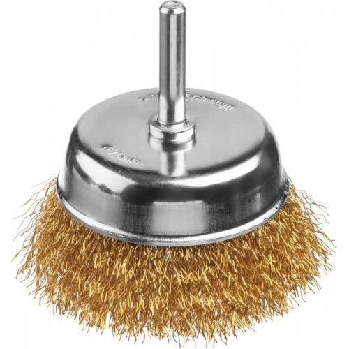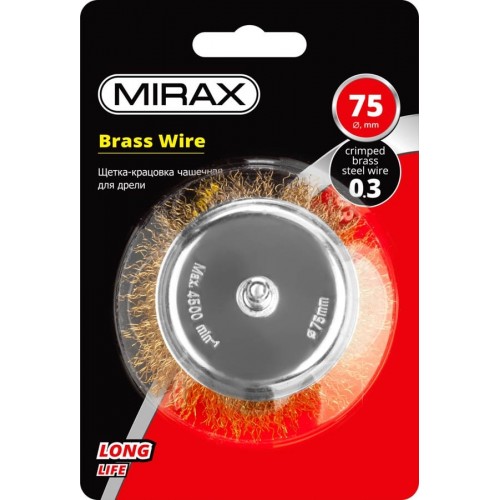 Щетка чашечная для дрели MIRAX 35147-075, предназначена для удаления застарелых лакокрасочных покрытий, въевшейся грязи, ржавчины, окалины с поверхностей изделий из стали и цветных металлов. Каждая щетка-крацовка MIRAX проходит обязательный контроль качества. Все изготавливаемые щетки соответствуют действующим стандартам качества и обеспечивают безопасную работу в четко регламентированном диапазоне оборотов. Витая стальная латунированная проволока. Латунированное покрытие защищает рабочую часть щетки от коррозии.
